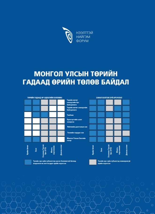 Монгол Улсын төрийн гадаад өрийн судалгааг Нээлттэй Нийгэм Форумын захиалгаар “Сэргэлт Консалтинг Групп” ХХК-ийн судалгааны баг хийж гүйцэтгэн Монгол Улсын төрийн гадаад өрийн хэмжээ, түүний цаашдын төлөв байдлыг тооцоолж, өрийн тогтвортой байдалд дүгнэлт өгснийг сонирхогч талуудад хүргэж байна.
