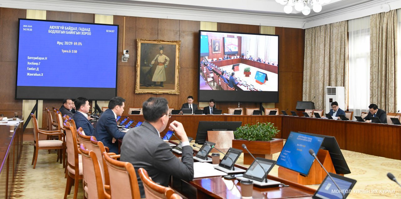 Улсын Их Хурлын Аюулгүй байдал, гадаад бодлогын байнгын хороо өнөөдөр /2025.10.01/ хуралдаж Монгол Улсын 2026 оны төсвийн хүрээний мэдэгдэл, 2027-2028 оны төсвийн төсөөллийн тухай хуульд өөрчлөлт оруулах тухай хуулийн төслийн хоёр дахь хэлэлцүүлгийг хийлээ.